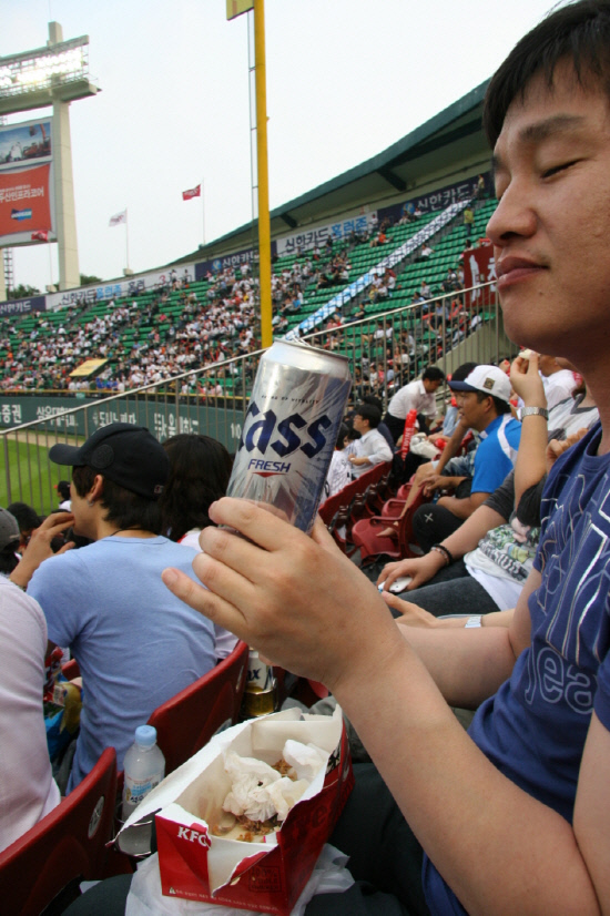 야구장에서는 구부정한 자세로 좁고 딱딱한 의자에 앉아 고개를 쑥 내밀고 턱을 괴고 서너 시간 동안 관람한다.