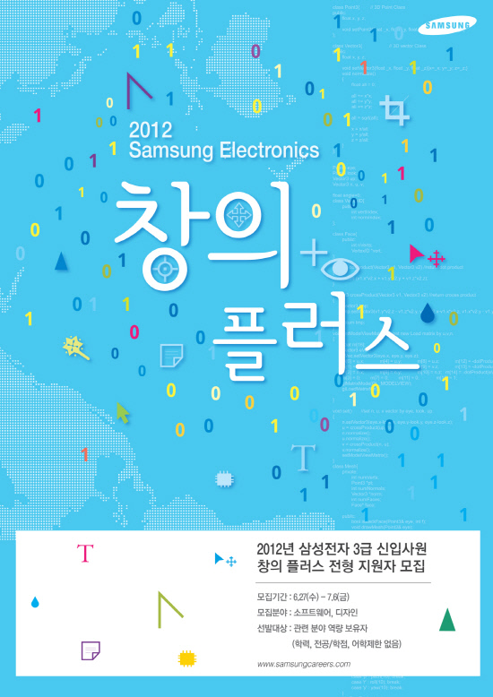 삼성전자는 끼와 실력을 갖춘 창의적 인재 선발을 위해 '창의 플러스(Plus) 전형'을 실시한다. 지난해 하반기 처음 실시된 '창의 플러스 전형'은 소프트웨어, 디자인 분야 지원자를 대상으로 필기시험(삼성직무적성검사)없이 면접만으로 채용하는 제도다.