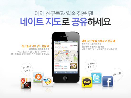 이용자들은 네이트 지도의 업체마다 표시되는 네이트온,싸이월드, 페이스북 등의 아이콘을 클릭해 간편하게 위치 내보내기를 할 수 있다.