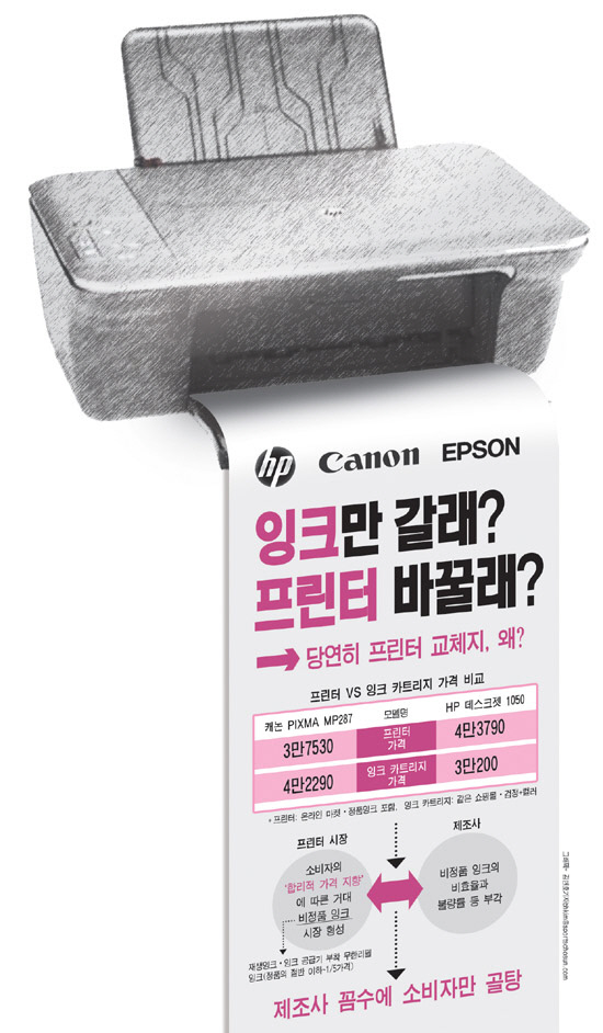 HP의 데스크젯 1050 잉크젯 프린터는 잉크 포함 가격은 4만3790원, 잉크값은 3만200원으로 프린터 가격의 73%에 달했다.