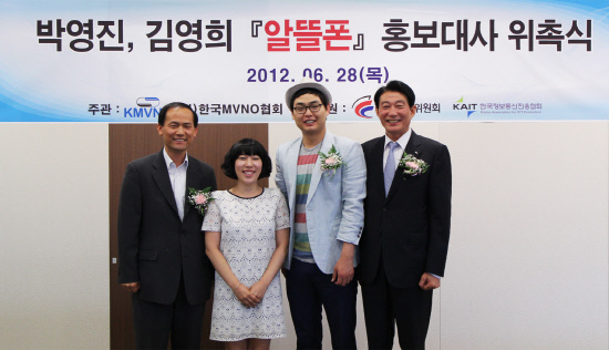 한국MVNO협회(KMVNO)가 '두분토론'의 주인공 개그맨 박영진, 김영희가 알뜰폰 홍보대사로 위촉했다. 알뜰폰은 기존 이동통신사업자로부터 망을 임차해 이용자에게 자체 브랜드의 통신서비스를 제공(재판매)하는 서비스인 이동통신 재판매(MVNO) 서비스의 다른 말이다. 통신비를 절약해 알뜰하게 이용할 수 있다는 의미. MVNO라는 이름이 생소하고 어려워 한 달여간의 공모전을 통해 이용자에게 쉽게 다가갈 수 있는 용어로 알뜰폰이 선정됐다.