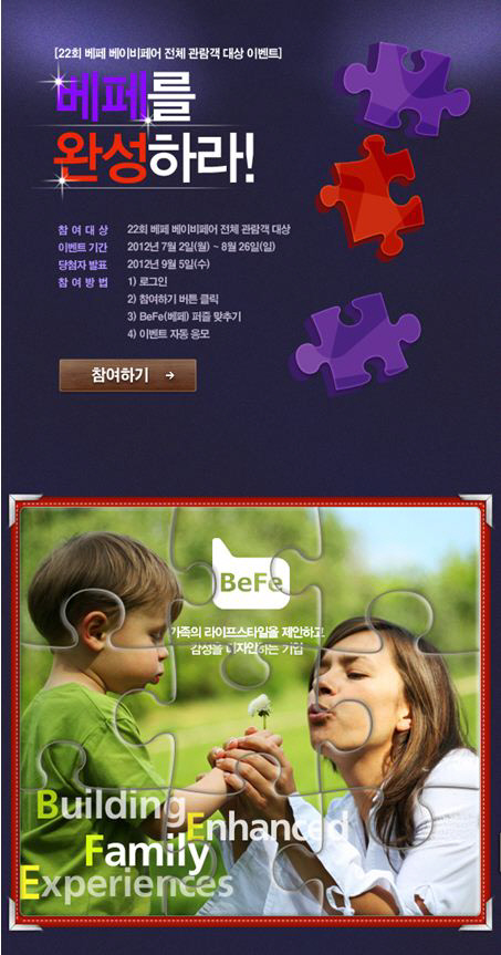 서울국제 임신 출산 육아용품 전시회(이하 베페 베이비페어)의 주최사 ㈜베페(대표 이근표, www.befe.co.kr)가22회 베페 베이비페어 개최를 맞아 행사 마지막날인 8월 26일까지 전체 관람객을 대상으로 조각그림(직소 퍼즐) 맞추기 이벤트를 실시한다.