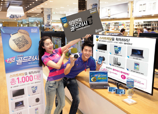 삼성전자가 런던 올림픽 마케팅을 본격적으로 전개한다. 27일부터 런던에서 국가대표 선수들이 금메달을 향해 땀을 흘리는 것처럼 대한민국 온 국민들도 전국방방곳곳에 있는 스마트 메달을 함께 향해 뛰어 보자는 의미의 '스마트메달을 향해 뛰어라-골드러시' 캠페인을 진행키로 했다. 스마트 메달을 많이 모으는 전 국민적 통합 마케팅이다.