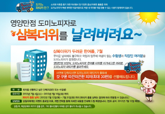 도미노피자(www.dominos.co.kr)가 7월 수험생과 직장인을 대상으로 '출동! 파티카, 더위 타파 피자파티' 이벤트를 진행한다.