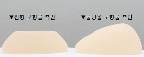 물방울 보형물은 위는 잘록하고 아래로 갈수록 볼록해지는 모양이다. 마치 물방울이 떨어지는 모양 같다고 해서 붙여진 이름이다. 보형물의 앞부분은 비교적 강도가 높아 가슴의 형태를 유지하고, 뒷부분은 부드럽기 때문에 몸의 동작에 따라 자연스럽게 움직이는 특징이 있다.
