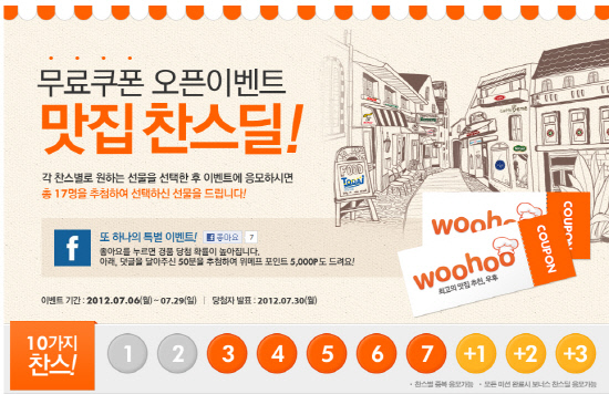 7개의 찬스딜 미션 완료시 아이패드2와 백화점 상품권을 추가로 선물 받을 수 있는 보너스 찬스딜도 함께 제공된다. 보너스 찬스딜은 우후가 새롭게 선보이는 '무료쿠폰'을 다운 받으면 응모 가능하다. '무료쿠폰'은 상시 할인을 받을 수 있는 쿠폰을 제공하는 서비스로 현재 우후 사이트에서 백세주마을, 서브웨이, 피자몰, 타코벨 등 총 300여장의 지역별 할인 쿠폰을 받을 수 있다.