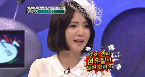 최근 케이블 채널 tvN '화성인 바이러스'에 2년 전부터 종이를 즐겨 먹는 여성이 출연했다. 이른바 'A4쌈녀'라고 불리는 그녀는 스튜디오에서 종이로 삼겹살을 싸서 먹고, 종이 죽을 만들어 먹어 시청자들을 경악케 했다. 종이를 먹게 된 계기를 묻자, 그녀는 "심한 변비를 치료하기 위해서"라고 대답했다. A4쌈녀와 같이 음식이 아닌 것을 먹는 것도 병이다. 이를 '이식증(異食症)'이라고 한다.