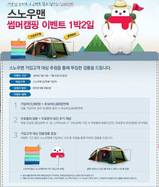 스노우맨 가입 고객에게는 스포츠 타월과 스노우맨 부채를 선물로 주고, 추첨을 통해 콜멘 라운드스크린 2룸 하우스 텐트 4~5인용을 5명에게 증정할 예정이다. 온세텔레콤 관계자는 "스노우맨 서비스를 저렴하게 이용하는 것은 물론 더위를 날려줄 경품까지 얻는 일석이조의 기회가 될 것"이라고 말했다.