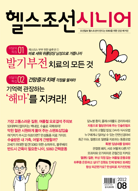 활기찬 생활을 위한 건강 매거진 '헬스조선시니어' 8월호<사진>가 나왔다. 이달에는 두 가지 특집을 준비했다. 첫 번째는 섹스리스 부부 솔루션 1탄으로 '발기부전 치료의 모든 것'을 다뤘다. 발기부전이 생기는 원인, 생활요법, 치료제 복용, 심리상담, 수술법 등을 알려준다. 두 번째 특집은 건망증과 치매를 예방하는 '기억력 강화법'이다. 뇌에서 기억력에 가장 큰 영향을 미치는 '해마'를 지키는 모든 방법을 만날 수 있다.