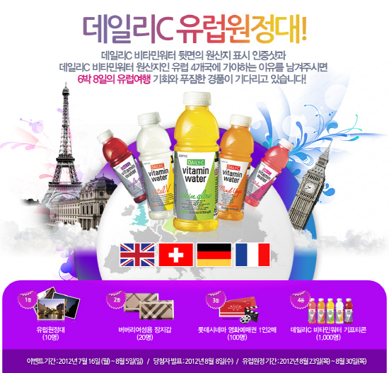 유럽원정단 이벤트는 영국, 프랑스, 독일, 스위스 등 4개국의 비타민이 담긴 '데일리C 비타민워터'의 비타민 원산지를 알리고 소비자에게 현지 탐방의 기회를 제공한다. 참여 방법은 '데일리C비타민워터' 페이스북(www.facebook.com/dailycvitaminwater)에 접속해, '데일리C 비타민워터'와 함께 찍은 인증샷과 함께 유럽 4개국에 가야 하는 자신만의 사연을 응모하면 된다.