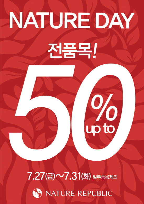 네이처리퍼블릭은 전국 260여 개 오프라인 매장과 온라인 쇼핑몰(www.naturerepublic.co.kr)에서 '네이처 데이' 행사를 동시에 진행하고, 기존 회원과 신규 회원에게 제품 구매시 50~30%(일부 품목 제외) 할인 혜택을 제공한다. 이번 행사 품목에는 여름철 필수품인 수분 라인을 비롯해 인기 제품, 신제품까지 포함해 혜택을 강화했다.