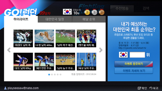 SK커뮤니케이션즈(대표 이주식)는 이번 런던 스포츠 빅 이벤트를 맞아 하이라이트 영상과 대회정보를 제공하는 삼성전자 스마트TV기반의 '네이트TV'를 출시했다.