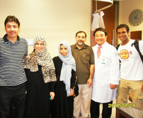 이대여성암병원에서 유방암 수술을 받은 나왈 압둘라 알자와리 씨(왼쪽에서 세번째)와 보호자들이 수술을 집도한 백남선 병원장과 기념 촬영을 하고 있다.