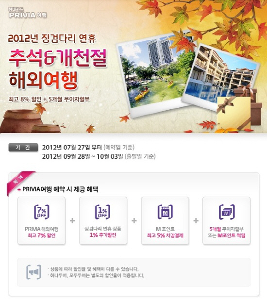 이벤트 기간 동안 프리비아 여행의 징검다리 연휴 상품을 이용할 경우, 최고 7%의 할인과 함께 연휴 특별 할인 1%를 추가로 받을 수 있다. 또 M포인트 5% 차감 서비스와 5개월 무이자 할부(~9월 30일)의 혜택까지 더할 경우 성수기 비용 때문에 해외여행을 고민하는 고객들의 부담을 크게 낮춰줄 것으로 기대된다. 실제 추석 당일(9월 30일) 출발하는 120만원 상당의 오사카 3박 4일 여행의 경우, 최고 8% 할인과 M포인트 5%차감, 5개월 무이자 혜택 등을 전부 적용한다면 월 21만원 미만으로 즐길 수 있게 된다.