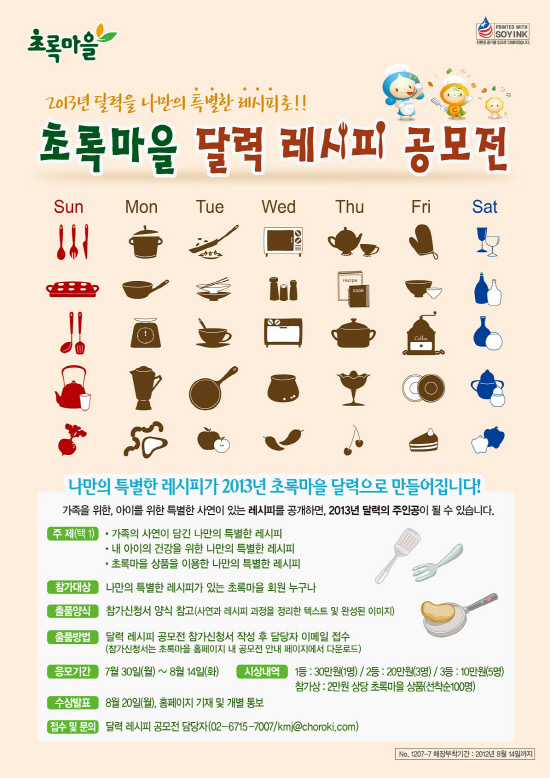 또한 초록마을은 '2013년 달력 레시피(Recipe) 공모전'을 실시하고 있다. '내 아이의 건강을 위한 레시피', '가족의 사연이 담긴 레시피', '초록마을 상품을 이용한 레시피' 등 소중한 사연이 담긴 특별 레시피를 공모하고 있는 것.