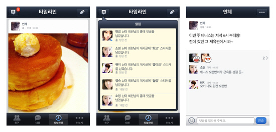 타임라인은 글, 사진, 동영상, 댓글 등 라인 친구들의 소식을 타임라인 형식으로 모아서 살펴볼 수 있도록 했다. 안드로이드 기기에서만 이용이 가능하며 앱스토어에 출시될 예정이다.