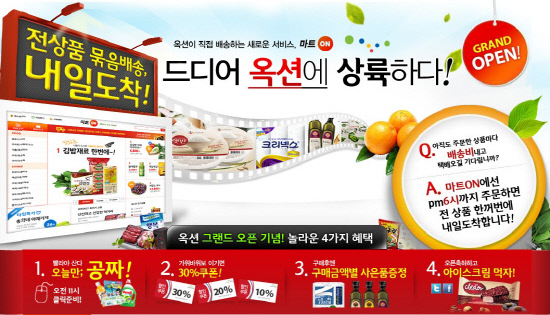 '마트ON'에서는 다양한 상설할인 코너도 마련한다. '오늘만 파격특가' 코너에서는 오전 10시부터 한가지의 인기상품을최대 50% 파격특가에 한정수량으로 판매하며 3만원이상 구매 시 구매금액대별 100% 사은품 증정 및 무료배송 등 다양한 혜택도 제공한다.