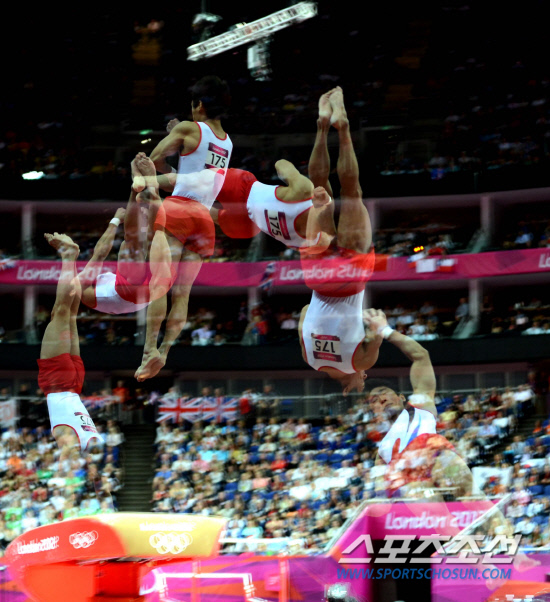 2012 런던올림픽 체조대표팀의 양학선이 6일(현지시간) 런던의 노스 그리니치 아레나에서 열린 기계체조 남자 도마 결선에서 도약을 선보이고 있다. '도마의 신'이라고 불리는 양학선의 화려한 공중 도약 동작들이 다중노출 촬영기법으로 드러난다.런던=올림픽사진공동취재단j