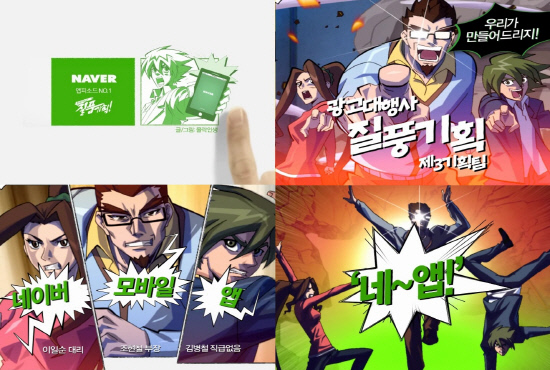 11일부터 선보일 이현민 작가(필명: 몰락인생)가 제작한 '네이버앱 홈'편은 웹툰으로도 유명한 광고대행사 '질풍기획'에서 일어나는 에피소드를 코믹하게 연출했고, 뒤이어 전파를 타게 되는 조석 작가의 '네이버앱 지식iN'편은 일상생활에서 네이버앱을 개성 있게 사용하는 모습을 특유의 위트와 함께 담았다.