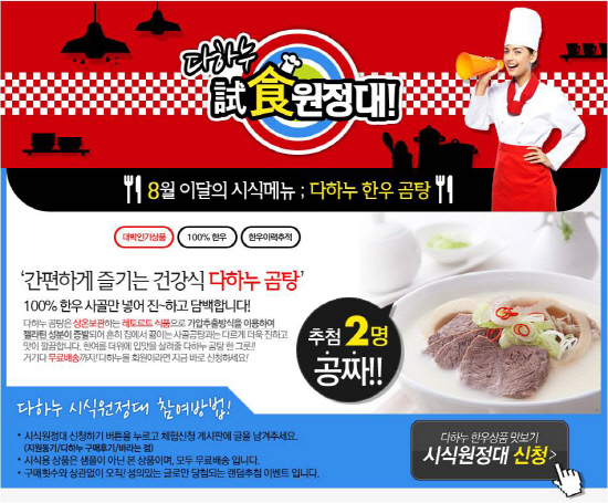 신청자 중 추첨을 통해 '다하누 한우 곰탕'를 배송해 드리고 맛있게 시식한 후 시식체험 후기글을 남기면 또 한번의 당첨 기회를 주는 혜택도 준비돼 있다.