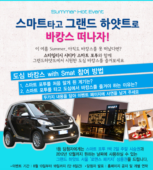 13일부터 18일까지 열리는 도심 바캉스 이벤트는 22세 이상의 운전면허 소지자라면 누구나 참여 가능하며 스마트코리아 공식 홈페이지(www.smart-k.com)에 스마트 포투를 처음 알게 된 계기, 스마트 포투를 타고 도심 바캉스를 떠나고 싶은 사연을 작성하면 신청이 완료된다.