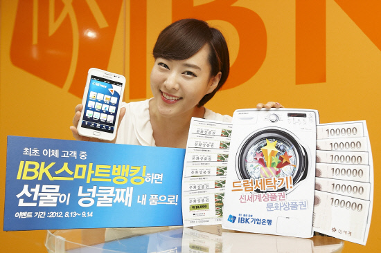 IBK기업은행(www.ibk.co.kr)은 스마트폰을 이용해 처음으로 계좌이체하는 고객 중 1000여명을 뽑아 경품을 제공하는 '스마트뱅킹 행복충전 이벤트'를 실시한다.