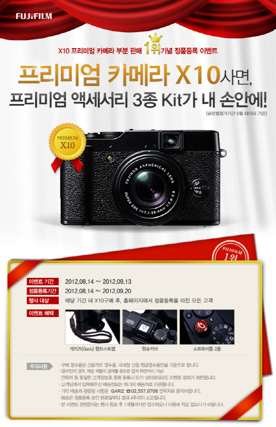 이벤트는 8월 14일부터 9월 13일까지 한 달간 진행된다. 기간 내 X10을 구매하고 후지필름 홈페이지(www.fujifilm-korea.co.kr)를 통해 정품 등록을 완료한 누구에게나 프리미엄 액세서리 3종 키트를 증정키로 했다.