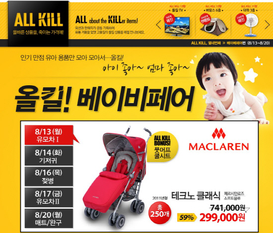 13일에는 영국 윌리엄 왕자가 애용해 명성을 얻은 유명 유모차 브랜드 제품 '맥클라렌 테크노 클래식(2011년형)'을 기존가 보다 59% 할인된 29만9000원에 250개 한정 판매한다. 페르시안레드, 소프트블루 두 가지 색상 중 선택할 수 있고, 여름용 쿨시트와 겨울용 풋머프까지 세트로 제공된다. 17일에는 3단 컴팩트 폴딩구조로 휴대가 간편한 '퀴니 제프 레벨레드 유모차(2012년형)'를 50% 할인된 22만 5000원에 만나볼 수 있다.