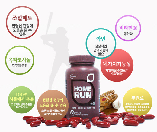 이 같은 기대는 성분에서 찾을 수 있다. 홈런의 주요성분은 쏘팔메토, 옥타코사놀, 비타민 E, 아연이다. 쏘팔메트 열매추출물은 전립선에 좋은 것으로 알려져 있고, 옥타코사놀은 지구력 증진 도우미다. 비타민E는 활성산소로부터 세포를 보호하고, 아연은 면역기능 강화와 세포분열에 필요하다.