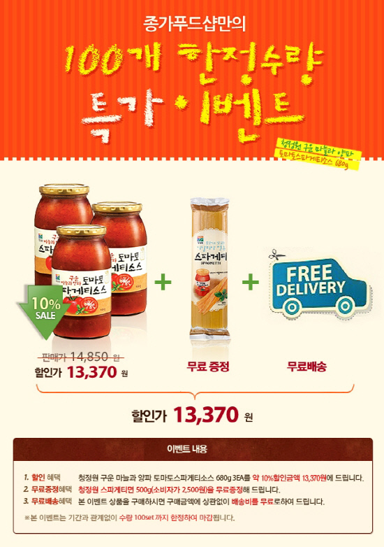 대상의 온라인 쇼핑몰 종가푸드샵(www.chonggafood.com)에서 청정원 스파게티 소스 특별 이벤트를 100개 한정으로 진행한다.