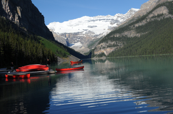 레이크 루이스는 이른 아침 찾는 게 더 볼만하다. 해가 중천에 떠 있을 때 보다는 쿨 하고도 청초한 기운을 느낄 수 있기 때문이다. 거기에 에메랄드 빛 물길을 가르는 붉은색 카누를 바라보자면 경관의 극치, 완벽한 색상의 조합을 실감하게 된다.