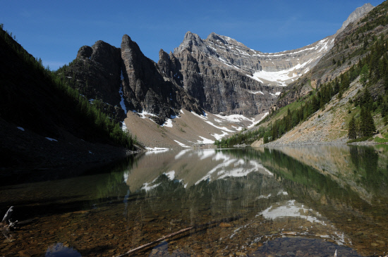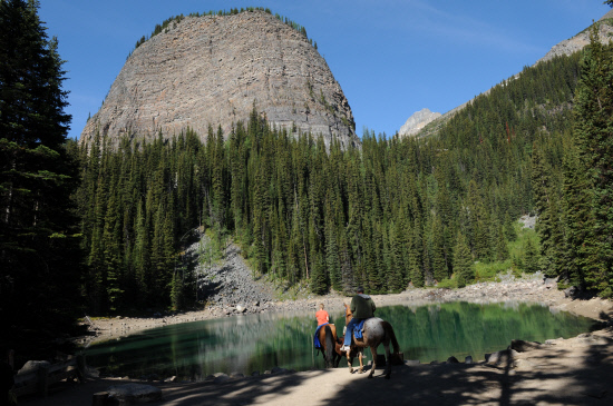숲 사이로 간간히 옥색 물빛이 영롱한 레이크 루이스가 펼쳐진다. 한참을 오르니 눈앞에 우뚝 솟은 암봉이 나타난다. 예사롭지 않은 봉우리다. 하지만 풍광은 여기서 그치지 않는다. 그 아래로 아담한 호수가 펼쳐져 있다. 거울처럼 맑다는 '레이크 미러'이다. 레이크 루이스에서 2.6㎞ 올라 온 지점이다. 호수를 가로지르는 시원한 바람에 땀을 식히자니 별안간 말을 타고 온 탐방객들이 나타났다. 말은 차가운 호수 물로 목을 축이고 사람들은 사진 촬영에 여념 없다.
