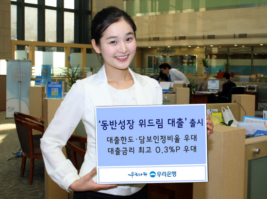 우리은행(은행장 이순우)이 '동반성장 위드림 대출'을 출시했다. 동반성장 위드림 대출은 대기업과 은행의 상생협약을 바탕으로 대기업의 상생자금을 우리은행에서 예치하고 해당 자금에 대한 이자의 일부분을 출연해 협력기업의 자금 부담을 추가적으로 줄일 수 있도록 한 상품이다. 대기업의 중소협력기업이 75%이상 제조업 및 수출입 기업인 점을 고려해 개발한 상품으로 제조업에 대하여는 시설자금대출 한도를 5%~ 10%P 확대하고, 담보인정비율도 10%P ~ 15%P 확대해 중소기업들이 좀 더 큰 혜택을 받을 수 있도록 한 게 특징이다. 수출입기업의 경우 외환 전신료는 물론 수출환어음 환가료를 최고 1%P, 수입신용장 인수수수료를 최고 0.15%P 우대하는 등 다양한 혜택을 제공 받을 수 있다.