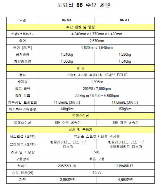 감성을 자극하고 군더기 없는 강렬한 외관 디자인은 스포츠카로 부족함이 없다. 실내는 운전에 집중할 수 있도록 최대한 치장을 절제했다. 고속주행시 안정감을 더해주는 낮은 차체와 200마력대 후륜구동에 적합한 53:47의 무게 배분이 인상적이다. 직관적이고 민첩한 핸들링이 가능해진다. 정중앙에 배치된 rpm(엔진회전수) 게이지는 속도본능을 자극한다. 정확한 조향인 가능한 지름 365mm의 스포츠 핸들은 그립갑이 좋다. 오랫만에 만나보는 6단 수동기어가 단숨에 시선을 사로잡는다.