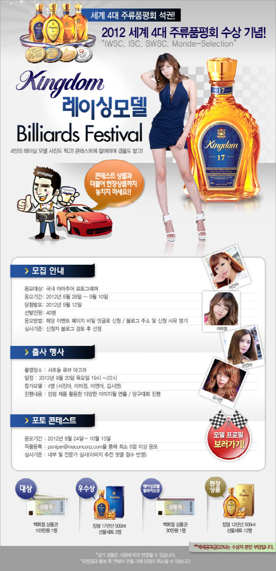 이 행사는 '킹덤'이 올해 열린 각종 국제위스키대회(ISC) 수상을 기념해 마련됐다. 레이싱 모델 4명이 벌이는 당구대회 모습을 사진에 담는 방식으로 대회가 진행된다. 킹덤 제품을 활용한 다양한 이미지월이 연출되며, 서진아, 이미정, 이연아, 김시연 등 4명의 레이싱 모델은 토너먼트 형식의 당구대회에 참가해 출사단의 촬영 모델로 나선다.
