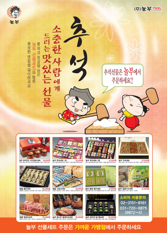 추석선물세트는 '놀부 갈아만든 고추장굴비세트', '놀부 참나무 훈제오리세트', '명품 고등어세트', '놀부 통영 멸치세트', '놀부 견과세트'등이다. ㈜놀부 관계자는 "명절 선물용 상품에 붙는 가격 프리미엄을 뺀 실속형 상품이라 부담을 줄일 수 있는데 초점을 맞췄다"며 "25년간 노하우가 담긴 만큼 만족도가 높을 것"이라고 말했다.
