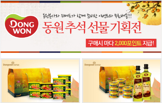 동원F&B와 함께 무료배송과 위메프 포인트 지급 등의 혜택을 제공하는 '동원 추석 선물 기획전'을 19일까지 진행된다. 위메프 단독 구성으로 선보이는 '동원 리챔 선물세트'는 시중가 3만4000원보다 18% 저렴한 2만 7900원에 구입할 수 있고 라이트 스탠다드 참치(100g) 8캔과 노블레 카놀라유(500ml) 2개로 구성된 '동원 참치 카놀라유 실속세트'는 1만8900원에 판매한다.