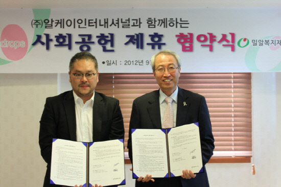 밀알복지재단(이사장 홍정길)과 (주)알케이인터네셔널(대표 노해영)이 6일 사회공헌활동을 구체화하고 활성화시키기 위한 사회공헌 제휴 협약식을 가졌다. 사회공헌 제휴 협약은 ㈜알케이인터네셔널의 신규 화장품 브랜드(Sevendrops)런칭과 함께 제품 판매 수익의 일부분을 빈곤 아동을 돕기 위한 기금으로 기부하기 위한 과정에서 진행됐다. ㈜알케이인터네셔널은 유통, 무역전문 기업으로 근래에는 친환경 유기농 화장품제조 및 판매 등 다양한 사업을 펼치고 있는 화장품 유통기업이다. 사회공헌 협약을 통해 알케이인터네셔널에서 제조하는 화장품의 주 원료의 생산지인 아프리카 마다가스카르의 빈곤 아동을 돕는 데 제품 판매 수익의 일부분을 기부하게 된다.