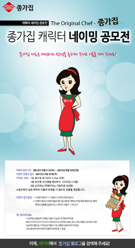 한편, 종가집은 이번 캐릭터 탄생을 기념해 '종가집 캐릭터 이름 짓기' 공모전을 진행한다. 응모 방법은 종가집 블로그(blog.naver.com/chefzzong_)의 이벤트 페이지에 댓글로 캐릭터 탄생 축하 메시지와 함께 어울리는 이름과 이유를 남기면 된다. 이벤트는 오는 24일까지 진행되며 수상자에게는 김장김치와 기프티콘 등 다양한 상품이 수여된다. 응모작은 심사를 거쳐 실제 캐릭터 이름으로 활용할 예정이다. 송진현 기자 jhsong@sportschosun.com