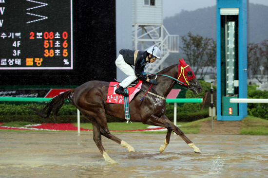 부경의 리딩자키로 불리는 조성곤 기수가 기승한 '당대불패'는 이날 비가 내려 젖어있는 주로의 이점을 살려 선행강공을 펼치면서 초반 경주를 이끌었다. 게이트번호 역시 유리한 1번을 배정받아 선행 작전은 어느 정도 예상된 터였다. 손쉽게 선두를 잡고 경주를 이끌던 '당대불패'를 12번마인 '파워풀코리아'(기승기수 유현명)가 끈질기게 따라붙었지만 최강의 국내산마인 '당대불패'를 넘어서기엔 역부족이었다. 1코너를 선회하면서 접전이 있었지만 인코너를 선점한 '당대불패'는 시종일관 여유 있는 경주전개를 펼친 끝에 1위로 골인했다.