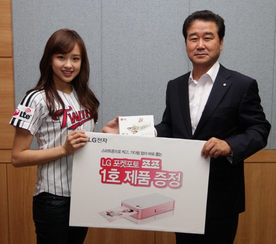 LG전자의 모바일 휴대용 프린터 포켓포토 '포포' 1호 제품이 손연재의 품에 안겼다. LG전자에 따르면 최상규 한국마케팅본부 본부장이 13일 잠실구장에서 손연재 선수에게 신제품을 전달했다.