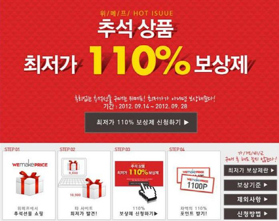 110% 최저가 보상제가 적용이 되는 상품은 패션/잡화부터 식품, 리빙, 디지털 등 다양한 구색을 갖춘 추석 관련 상품이다. 박유진 위메프 홍보실장은 "추석을 앞두고 고객들이 최저가의 고품질 상품들을 마음 놓고 구입할 수 있도록 이번 '최저가 110% 보상제 기획전'을 준비했다"며 "앞으로도 소비자들이 가격을 비교할 필요 없이 안심하고 구매할 수 있도록 업체와 협의를 강화해 위메프가 판매하는 상품은 명실상부한 대한민국 최저가로 책정할 수 있도록 최선을 다할 것"이라고 말했다.