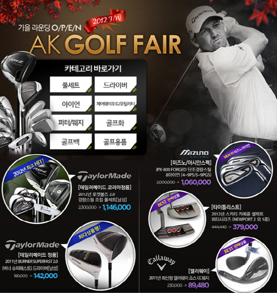 온라인쇼핑몰 AK몰(www.akmall.com)이 가을 라운딩을 위한 'AK 골프 페어'를 열고 골프 클럽 및 용품을 최고 50%까지 할인 판매한다.