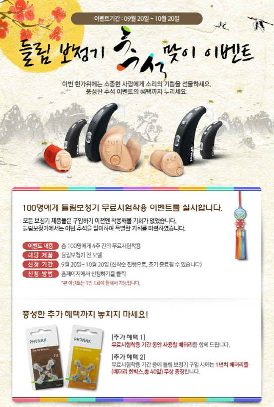 30만원대 보청기인 '들림보청기'가 추석을 맞아 선착순 100명을 대상으로 무료 체험 행사를 한 달간 진행한다.