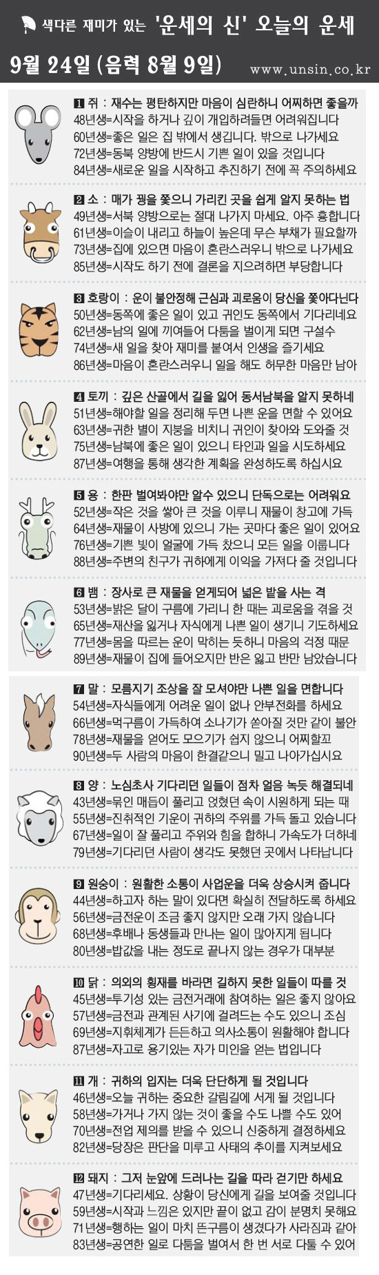 [띠별 오늘의 운세] 2012년 9월 24일 월요일(음력 8월 9일)