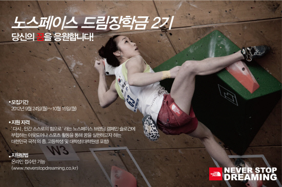 아웃도어 브랜드 노스페이스(www.thenorthfacekorea.co.kr)가 '다시, 인간 스스로의 힘으로'를 주제로 청소년을 지원하는 '노스페이스 드림장학금 2기'를 24일부터 다음달 15일까지 모집한다.