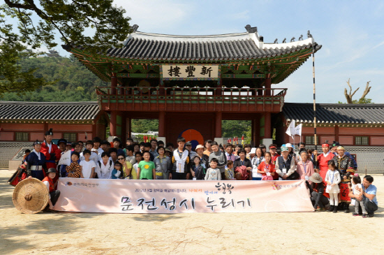 ◇'문전성시-전통시장 누리기 여행' 참석자들이 화성행궁 신풍루 앞에서 기념촬영을 하고 있다.