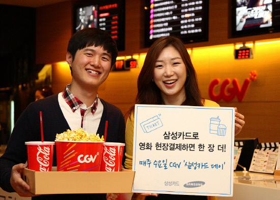 삼성카드(대표이사 사장 최치훈)는 11월28일까지 매주 수요일 전국 CGV에서 삼성카드로 영화 현장 결제를 하면 동반자 1인 무료 관람 혜택을 제공하는 'CGV 삼성카드 데이' 이벤트를 진행한다.