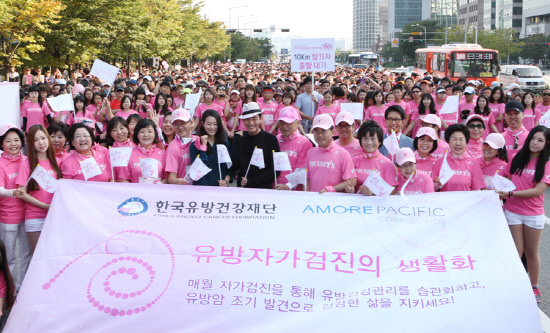이날 1만5000여명의 가족, 친구, 연인이 함께한 서울대회는 희망코스(10km)와 건강코스(5km)로 나눠 구성됐다. 마라톤 출발에 앞서 ㈜아모레퍼시픽 서경배 대표이사와 한국유방건강재단의 노동영 이사장의 축사, ㈜아모레퍼시픽 전속모델인 탤런트 신민아와 유아인의 격려 인사, 가수 손호영의 축하공연 등이 이어졌다.