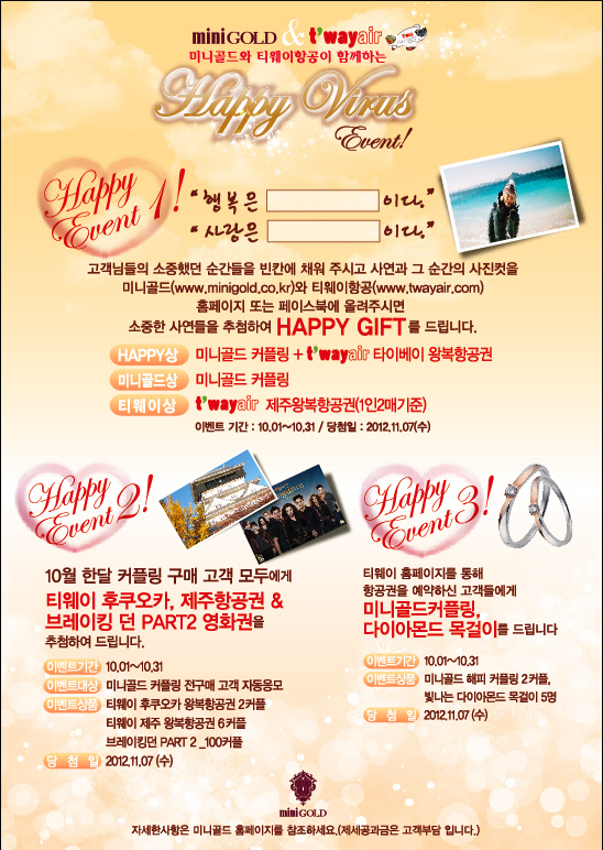 10월 한달 동안 진행되는 '미니골드-티웨이항공 공동 이벤트'는 후쿠오카와 타이페이에 커플여행을 보내주는 이벤트 등이 포함돼 있다. 미니골드 홈페이지(www.minigold.co.kr)에서 10월 31일까지 티웨이항공과 함께하는 'Happy Virus' 사연공모 이벤트를 진행한다. '행복은 OO이다', '사랑은 OO이다'의 빈칸에 본인이 생각하는 문구와 함께 그 이유를 간단히 적어 응모하면 된다. 총 3커플이 선정된다. 한 커플에게는 티웨이항공의 타이베이 왕복 항공권과 미니골드 커플링이, 다른 커플에게는 타이베이 왕복 항공권, 그리고 나머지 커플에게는 미니골드 커플링이 선물로 증정된다.